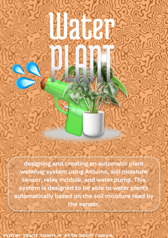 So in here, i’m going to show you the final project in 7th grade, it is the waterplant, all the way back to catching fruit, the water plant uses water pump of course, and the sensors, relay module, soil moisture, and the arduino, some of we call it brain somehow(is it), anyway it detects the soil if it dry or wet, if it dry, the relay will send the power using the battery, to the water pump and it will pump the water until the dirt wet, and empty it, if it detects wet, he will not send anything to the relay, and the relay not power up the water pump and then the water pump is not sending water to the soil