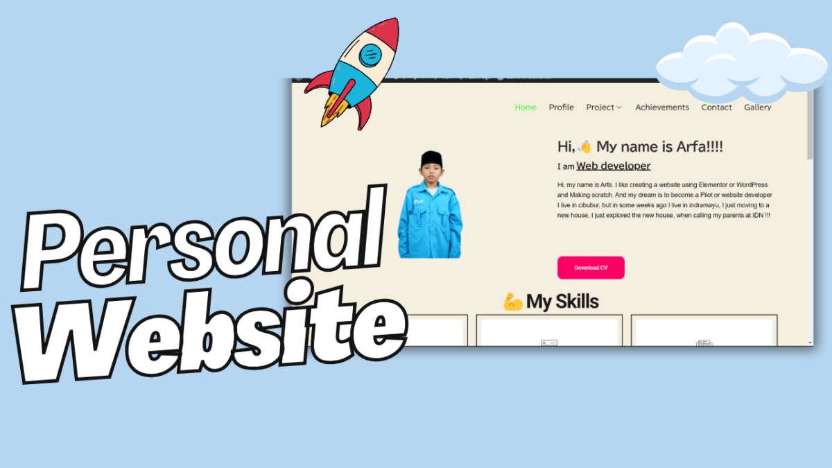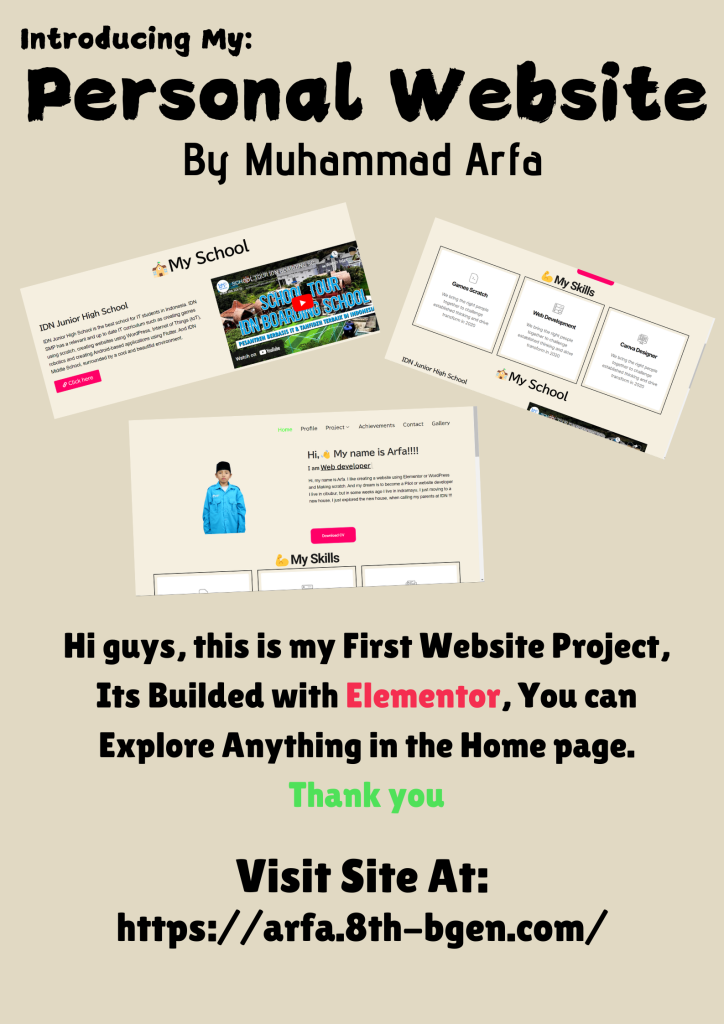 Hi Guys ! This is My First Website ever on WordPress, But I don’t use normal WordPress Editor, I use Elementor Editor, Elementkit Lite, Elementor Foorter Builder, and so much more you can Find it in the WordPress plugin Library. I have My Photo of me, and in the Home Page, Theres a Little Introduction About me, There’s also a Download CV button But it doesn’t Work, I will make the CV later in the Grade 9, My IT Teacher Said, and if you Scroll down, I will introduce My Skills Also there are three, and there’s I will introduce my School with the Visit Site Button if you want to know more about my School. Thank you🙏